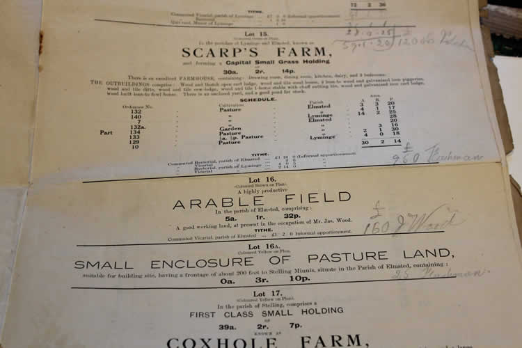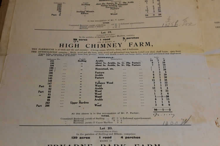 J: Yes. But my father was, he had a, he wasn’t a farmer. So he bought it, bought the original parcel as an investment. And only then did it become clear that I wanted to go farming. … So this is the estate in 1919, which totalled 1000 acres. And the… all the different farms were noted in it. And we have somewhere… Coxhole farm is part of this farm now. We have some of the land from that. And the Scarp’s farm is the one I just showed you the particulars of. And that got…and sold, that was 30 acres was sold for £950. High Chimney farm, that we’re here, 92 acres … that was sold for 1200 pounds including all the houses and everything.