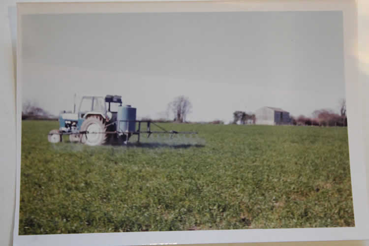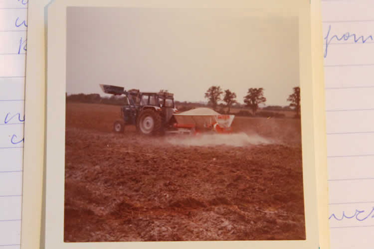J: I had always shown an interest, and … (looking through pictures)… That’s planting potatoes in 1989, a more modern sprayer, not modern anymore. … Converting our sheep building into a potato store.