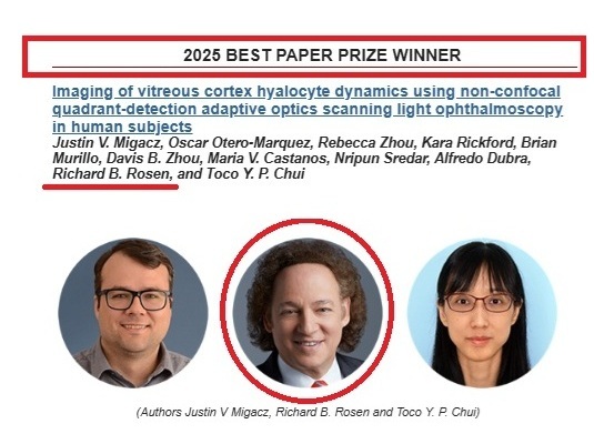 Justin V. Migacz, Oscar Otero-Marquez, Rebecca Zhou, Kara Rickford, Brian Murillo, Davis B. Zhou, Maria V. Castanos, Nripun Sredar, Alfredo Dubra, Richard B. Rosen, and Toco Y. P. ChuiThis paper delivers a groundbreaking achievement in non-invasively visualizing and tracking vitreous cortex hyalocytes in living human eyes, using an innovative approach to efficiently utilize quadrant-detection adaptive optics scanning light ophthalmoscopy. What particularly distinguishes this work is the exceptional image quality achieved with the proposed approach, despite these cells’ transparency. Such imaging enables detailed characterization of hyalocyte morphological dynamics and movement patterns and establishes a foundation for using these immune cells as potential biomarkers in retinal diseases such as diabetic retinopathy and glaucoma.