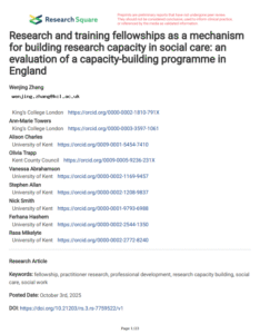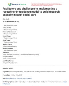 Keemink, J. R., Hotham, S., Zhang, W., Mikelyte, R., Smith, N., Hashem, F., Walton, G., Charles, A. & Towers, A. M. (2025). Increasing research capacity in adult social care: a research capacity-building partnership in Kent and its theory of change. NIHR Open Research, 5, 45. Click here to read: doi.org/10.3310/nihropenres.13890.2 |