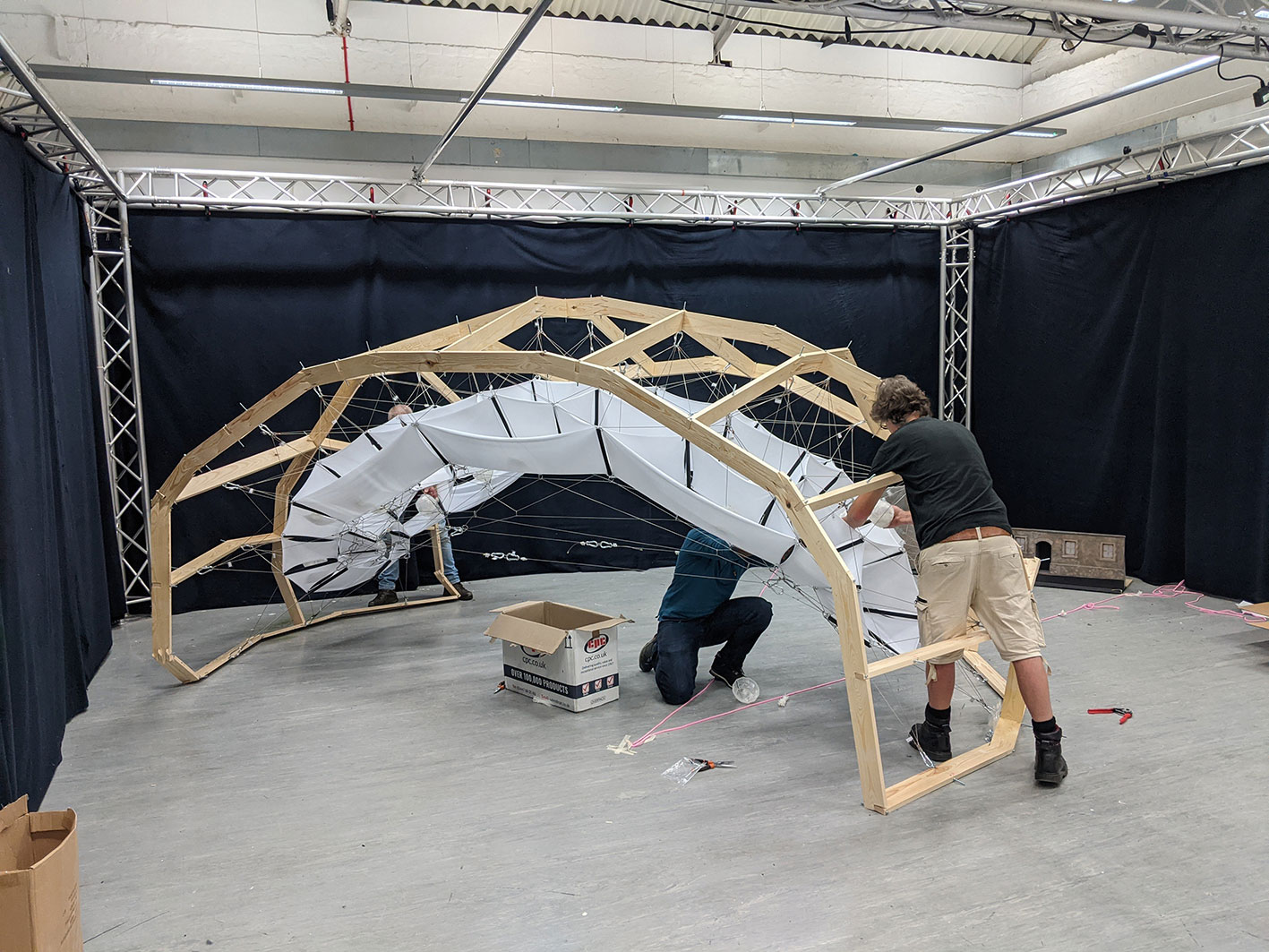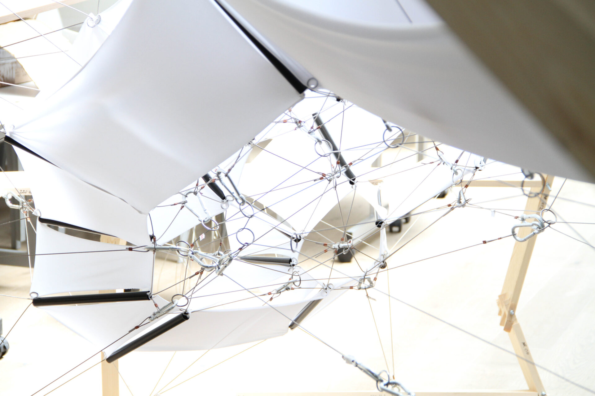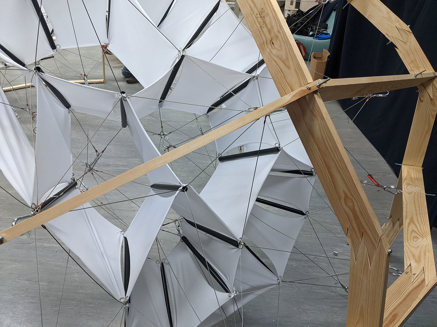 The structure consists of an outer layer of birch plywood members pulled inwards with wire-ropes. Rope ends connect at a triangulated mesh of wires in tension. The internal mesh is being stressed at the end of the assembly by pulling its four ends (two continuous wire-rope windings) that then pulls the outer thirty-eight cables connecting to the beams. Force is carried through a combination of bending and torsion in the outer beams and through pure tension in the wires. This follows a nature-inspired philosophy of different types of properties in biological structures [6]. Ultimately the structure is in a state of self-stress manifesting the principle that the global behaviour of a structure can be seen as the product of local actions [7], which is tested and proven by latest developments in graphic-statics and computational geometric methods for constructing bending moment and torsion diagrams on designated load paths [8]. In Kiesler’s terms, continuity is expressed as the strain is being carried along the structure in different forms. The connecting wires between the two main structural layers carry a series of waterproof fabric voronoi-like cell shapes. Each cell is individually lit with a set of six lights (one for each voronoi face) and proximity sensors provide input for color values.