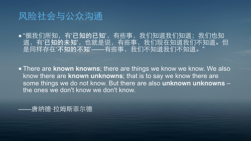 -这其中在欧美社会最广为流传的,还不是贝克这类社会学家的著作,而是前美国国防部长唐纳德·拉姆斯菲尔德那个新闻发布会上“绕口令”式的答记者问——“据我们所知,有‘已知的已知’,有些事,我们知道我们知道;我们也知道,有‘已知的未知’,也就是说,有些事,我们现在知道我们不知道。但是同样存在‘不知的不知’——有些事,我们不知道我们不知道。”