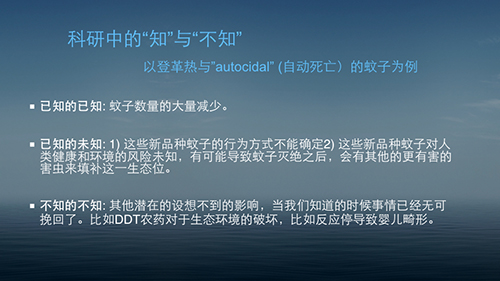 – 已知的未知: 1) 这些新品种蚊子的行为方式不能确定2) 这些新品种蚊子对人类健康和环境的风险未知,有可能导致蚊子灭绝之后,会有其他的更有害的害虫来填补这一生态位