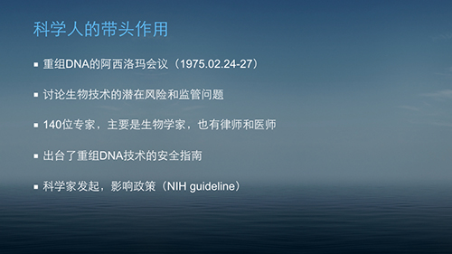 – 很长时间以来,对科研风险的控制主要依赖于科技圈内部遵守一定的伦理规范,比如幻灯片上显示的几个主要伦理规范(PPT图片显示:纽伦堡法典、赫尔辛基宣言、贝尔蒙特报告(Belmont Report)、涉及人的生物医学研究的国际伦理准则 、四原则、知情同意原则、风险预防原则)