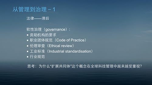 – 不知道大家有没有想过,前沿科研的良性发展其实很大程度上并不是依靠国家(government)的法律法规——因为相对前沿科研需求,法律几乎不可避免的有滞后性。所以前沿科研很大程度上是依靠软性的治理(governance),比如资助机构的要求,职业团体规范(Code of Practice), 伦理审查(Ethical review),工业标准(Industrial standardisation)及其他行业规范等。也正因如此,这些软性规则往往是在不同利益相关方在互动商榷中慢慢形成的