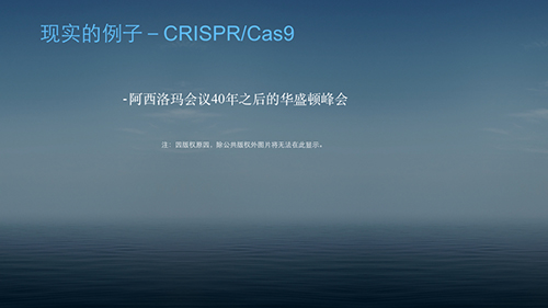 – 40年后的2015年12月, 这两位著名学者又把美国科学院、美国国家医学科学研究院、英国皇家学会和中国科学院的专家召集在一起,进行了对未来几十年生物技术发展有深远影响的华盛顿峰会。这次的主题是这近年的大热门技术,CRISPR/Cas9。