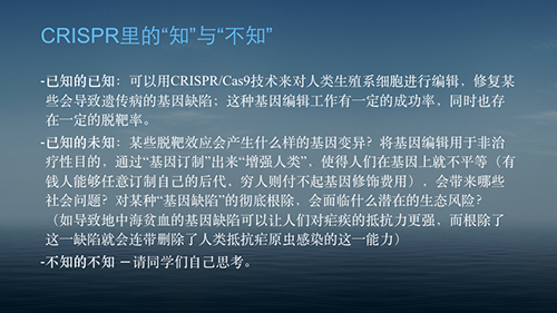 – 已知的已知:可以用CRISPR/Cas9技术来对人类生殖系细胞进行编辑,修复某些会导致遗传病的基因缺陷;这种基因编辑工作有一定的成功率,同时也存在一定的脱靶率。