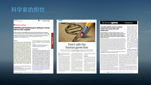– CRISPR/Cas9技术的发明者之一、加州大学伯克利分校的分子生物学家杜德纳(Jennifer Doudna)联合多位学者在《科学》上发表评论,认为考虑到现有技术的不足和风险,要审慎对待基因工程和生殖系基因修饰,不鼓励进行相关临床应用的尝试,因为公众的信任对于CRISPR/Cas9技术的发展应用具有重要意义。