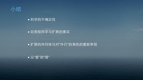 本节课先从科学研究具有不确定性谈起,由于科学不断进步,需要不断推翻已有的经验和结论,同时也就让我们认识到科学是有局限性的,科学研究要面临很多不确定性,包括已知的未知,和不知的不知。进入到后常规科学时代,科学研究对社会的影响更大,社会中的文化和价值因素对科学的影响也更大,于是有了气候变化这样的“后常规科学”,需要公众参与进来,提高研究的质量,形成“扩展的同行共同体”和“扩展的事实”。而我们对待科技发展的态度也要从刚性的管理转向柔性的治理,科学家与社会公众之间就重大的科技风险进行更多的沟通。