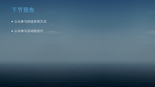 下节课将会介绍公众参与有哪些途径和方法,如何设计一项有效的公众参与活动。