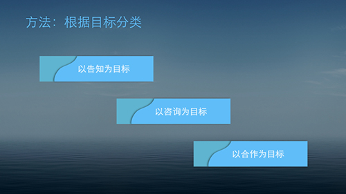 – 上面提到的是三个比较常见的途径,那每个途径之内,具体沟通时还有不同的方式方法,怎么选择呢?我们可以根据不同的目标来确定哪些形式更有效