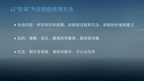 – 第一类,以“告知”为目标,这类似于我们一般意义上理解的科普,就是要向外行和公众传递科学知识和相关信息。