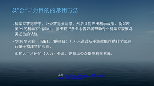 – 第三类,以“合作”为目标。除了科学家获得公众的支持和信任,科研成果更好地满足公众需要之外,还有一种共赢的方式是公众参与到科研的工作过程中来,科学家获得帮手,公众获得参与感,然后共同产出科学成果。如果听说过“公民科学家”,例如业余爱好者帮助专业科学家观察鸟类迁徙的轨迹、观星、监听太空信号等等,就对这种“合作参与”有点概念了。