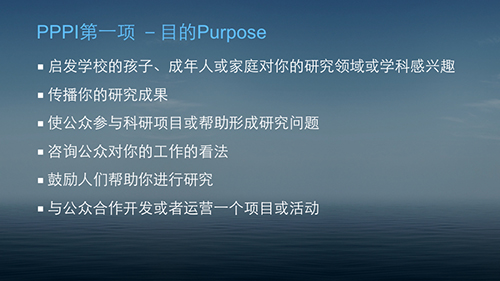 – 高质量的公众参与活动需要有针对性地设计适合的方案。下面简单介绍一套基于目的(Purpose)-对象(Person)-流程(Process)-影响(Impact)四维度考量的设计方法,简称PPPI法。若想了解更为详细的公众参与活动的设计、管理和评估的方法,可以访问NCCPE网站: