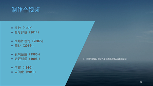 – 当然,对于普通科研工作者来说,制作影视或电视作品实在不现实,可能最多只能作为顾问或者被聘请为专家去参与。而如今网络平台提供了很多低成本的广泛传播的渠道。可以在喜马拉雅这样的应用上开设自己的电台,当播客;在微信上开个人公众号,推送自制的多媒体节目。