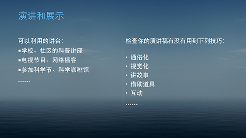 – 但是还有一个很实际的问题,就是具体怎么做呢?比如我是想写科普文章,但是我怎么觉得自己文笔不好?或者我是想利用多媒体让公众都了解、支持甚至痴迷于我的研究呢,可是我是个理科生,不像文科生那么会说,也不像艺术科学生那么会展现,我该怎么办呢?