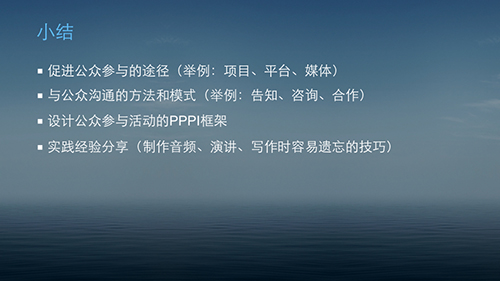 下节课将会以几个具体的案例来介绍国外开展公众参与活动的经验和教训,让同学们对本节课介绍的方法有更感性的认识。