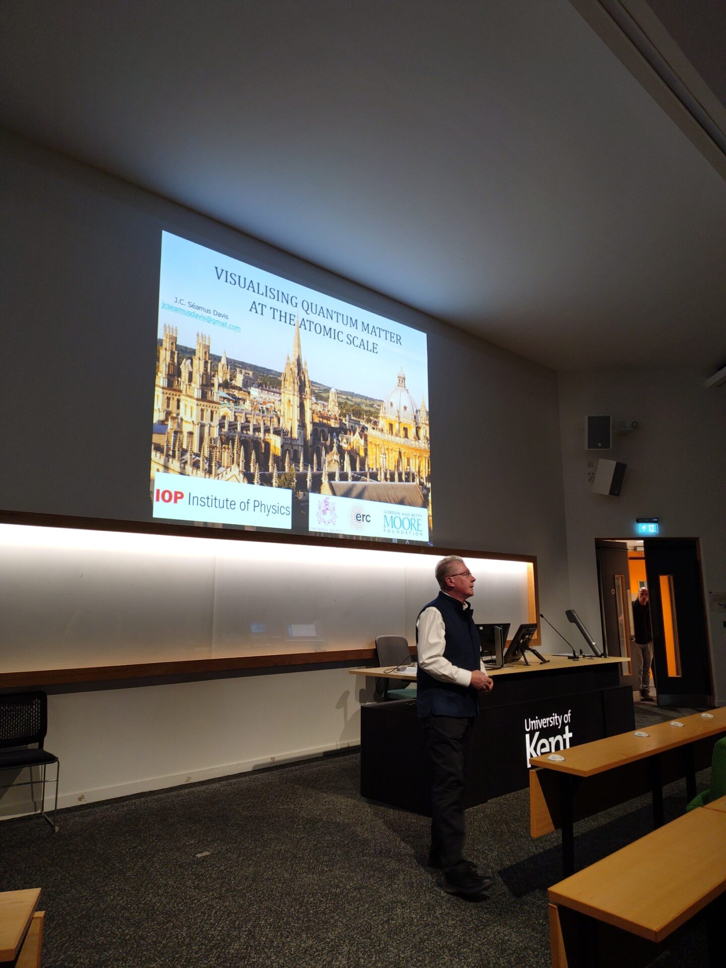 On Tuesday 7th of October 2025, the University of Kent welcomed Professor J. C. Seamus Davis from the University of Oxford and the University of Cork, who gave a talk on the work him and his team have been doing on macroscopic quantum matter. The talk was attended by a wonderful mix of students and general public, with about 45 people in attendance.